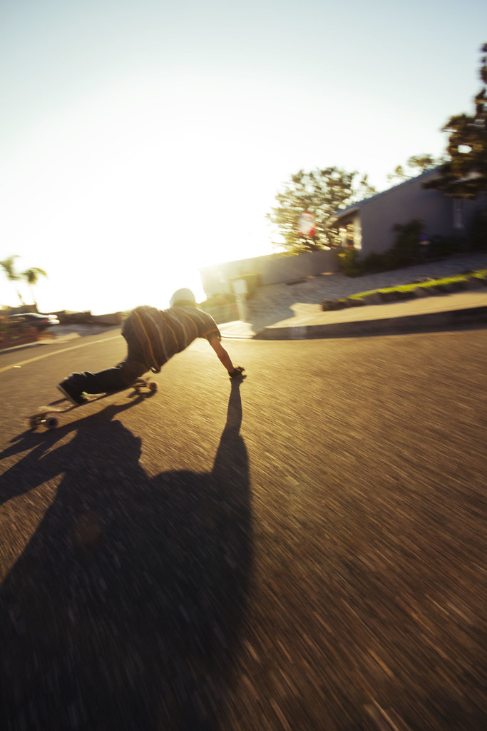 When I skate this road, I’m doing standup slides all the way down. Laguna OG Evren Ozan–dubbed “The Feather” by Striker for his smooth, light-on-the-board style–does two or three slides into the corners. Kevin and James did tons of slides in the video they made on that hill.