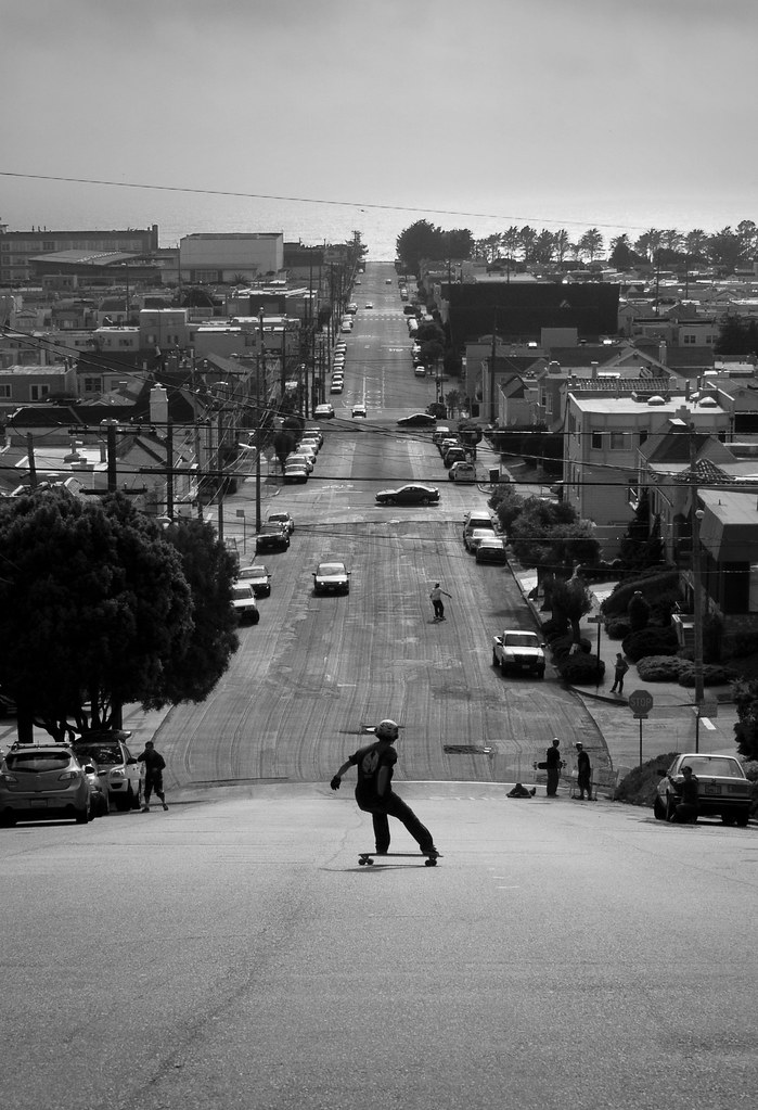 Gabe Simmons shredding the Sunset district of San Francisco. Check that NorCal foot placement: back foot on the truck, front foot in the middle with arms under control. Max Dubler photo.