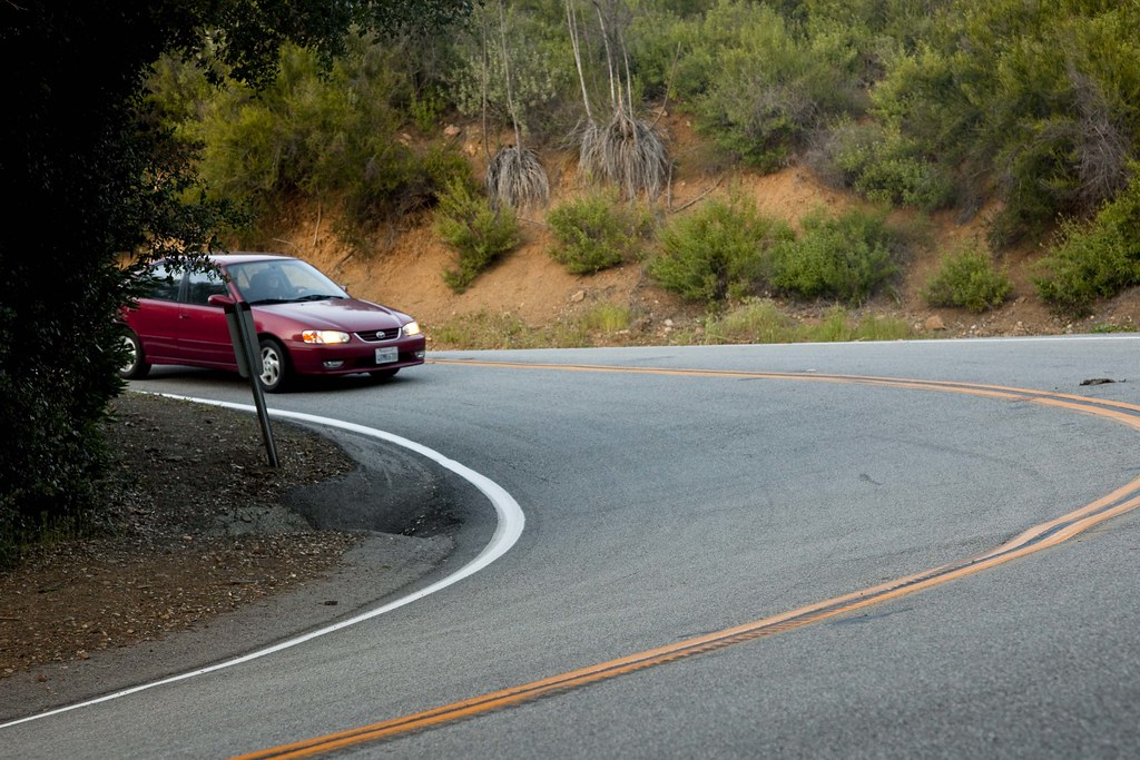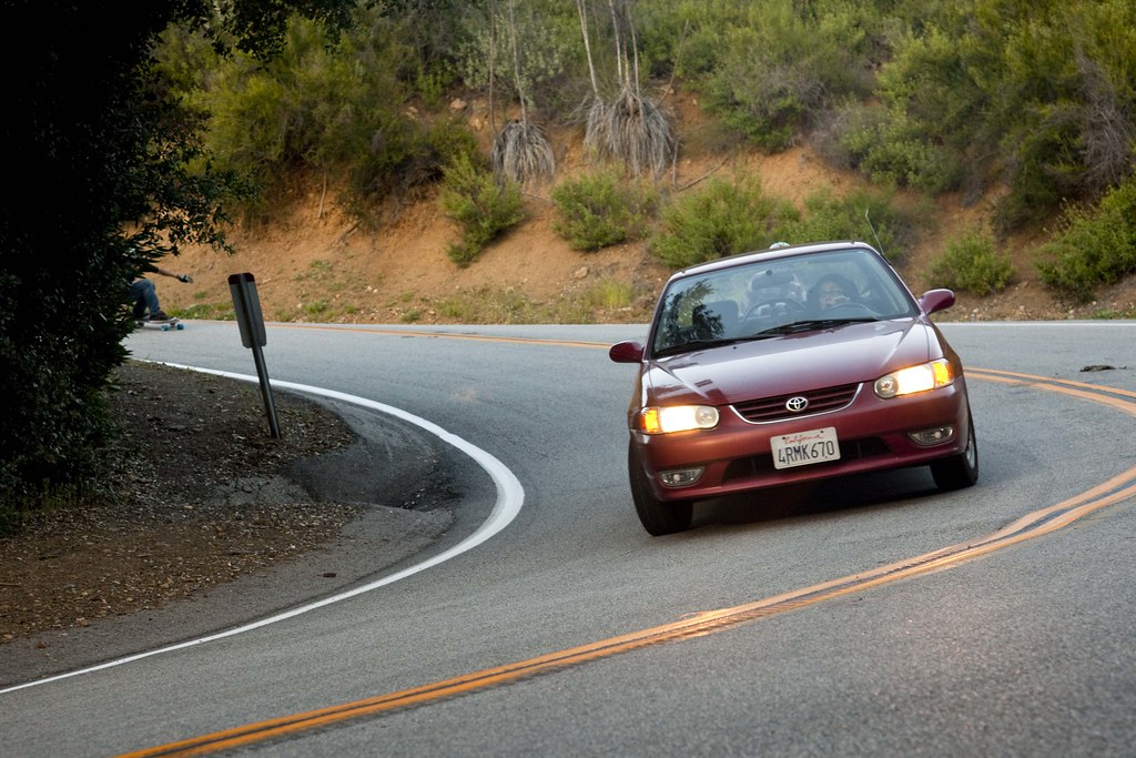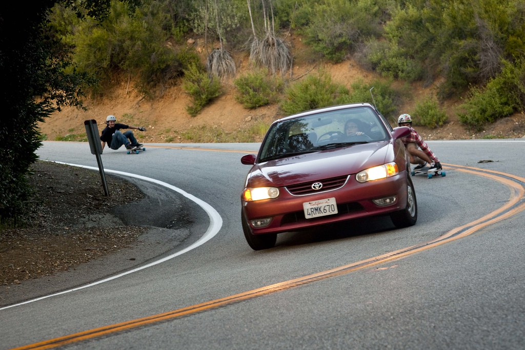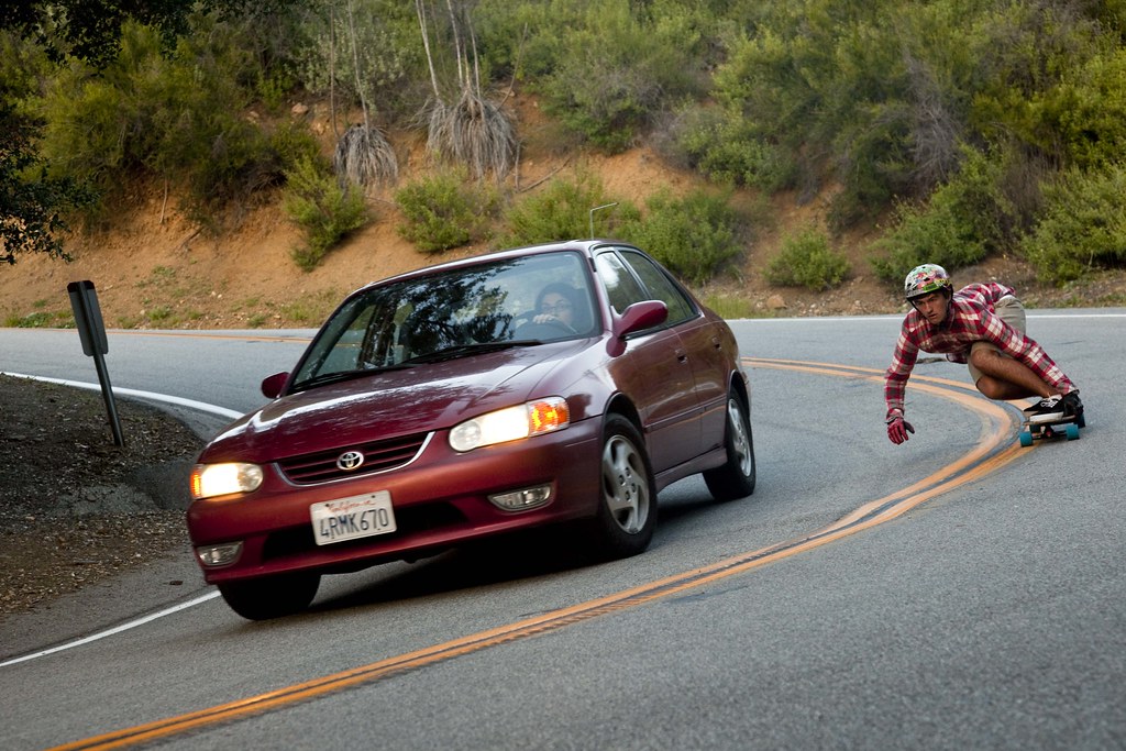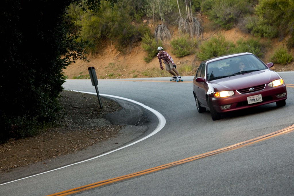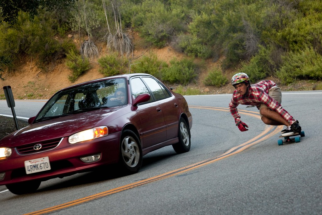 Passing cars isn’t something you should do on a regular basis. The driver of this red car saw Matt creeping up behind her, freaked out, and hit the brakes in the middle of the turn. Matt had to go around to avoid smashing into the back of the car. Max lucked out and got the shot. Always skate safely and within your limits!