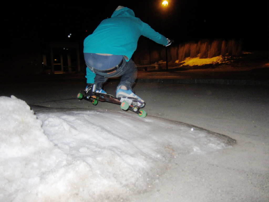 Nate Warren boosts an early grab off/over a lump of ice in Harvard, MA. Mike Girard photo. Check the SkateHouse sticker.