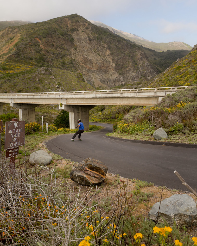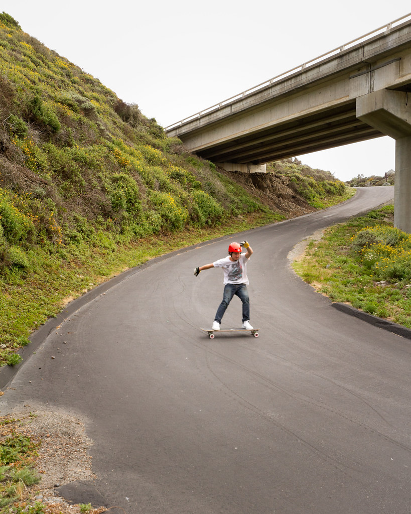 Unlike most people, skatehousemate and Landyachtz Legion of Shred rider Pat Schep doesn’t pop and lock his powerslides. He just kind of leans back until the skateboard starts sliding, then rides it out before he slows down too much. Rocking that style on sticky, resealed pavement like this can sometimes end badly, as the wheels tend to grip up unexpectedly; but Pat pulled this off straight out of the tour van, no problem.