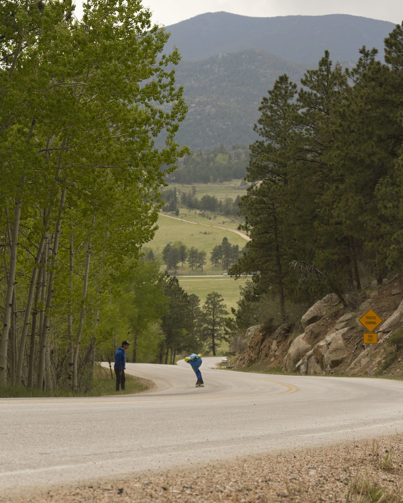 Just for the record: Jim Weatherwax was skating it from halfway back in the 90s. JP Kaloi, Dubes, and Josh Weisfeld were the first dudes to bomb it from the top, and Dubes is probably the first dude to do 70mph on a skateboard. Dubes, K-Rimes, and Zak Maytum were draft-training when they crashed at 70mph in 2008 and Billy Bones Meiners crashed going over 75 when he hit a pebble in August 2011. More recently, Colorado legend Kevin “Coop” Cooper took himself out at around 70. Patrick Rizzo bombed it on a street deck, then went switch on a downhill board. DT and Dave Angelus skated it naked in the dark a couple years ago and Mischo set his first IGSA world speed record there. Those who know, know that skating that hill was better than drugs.